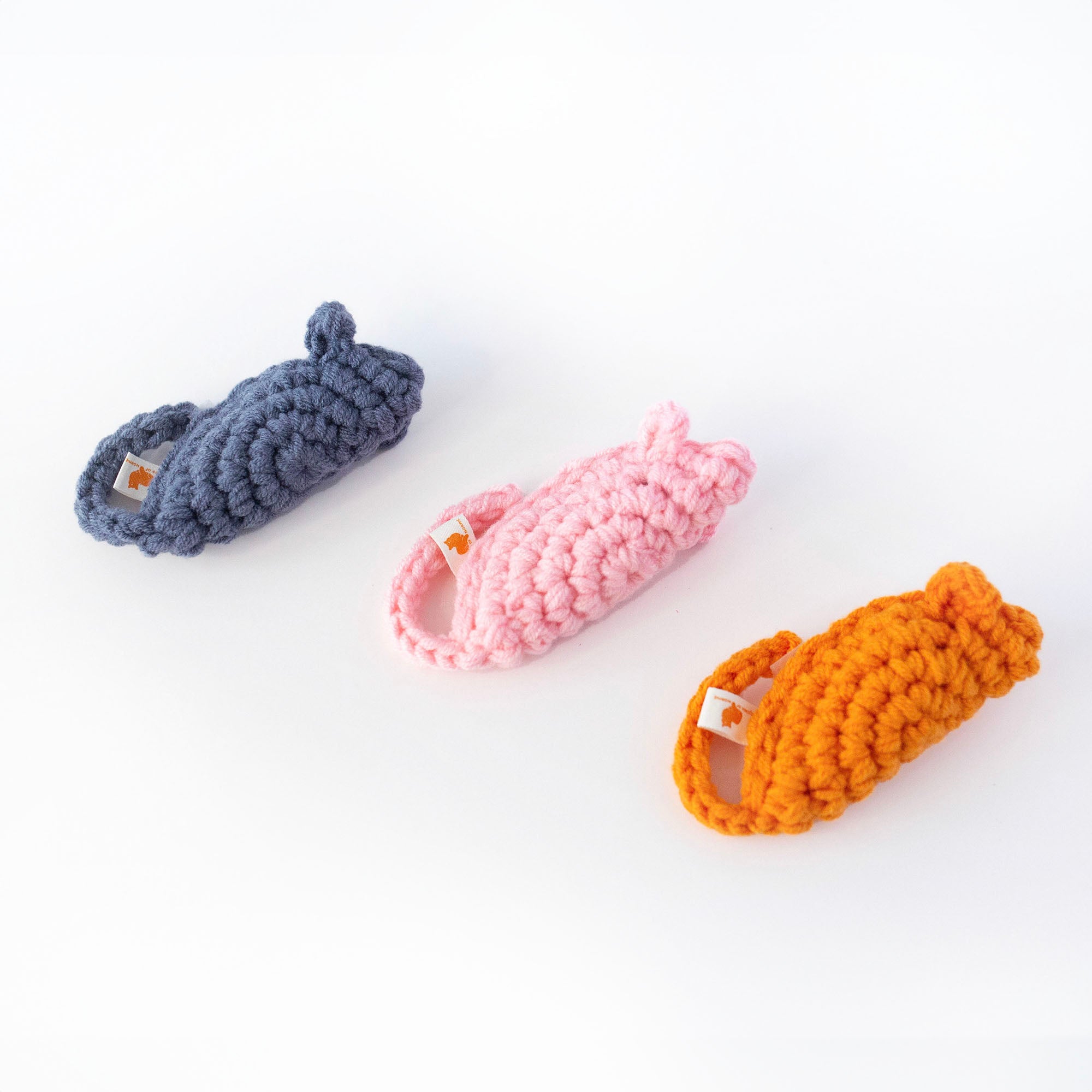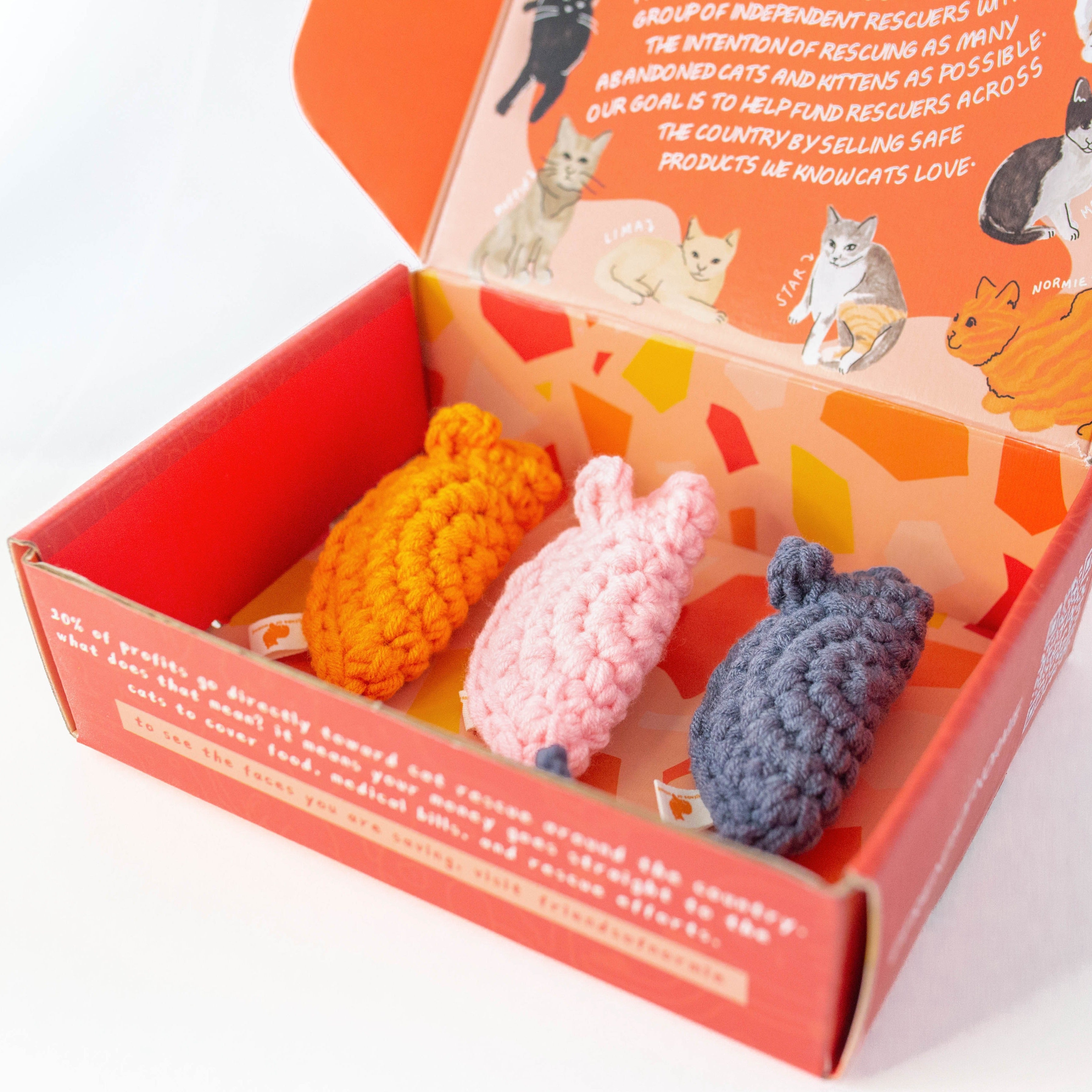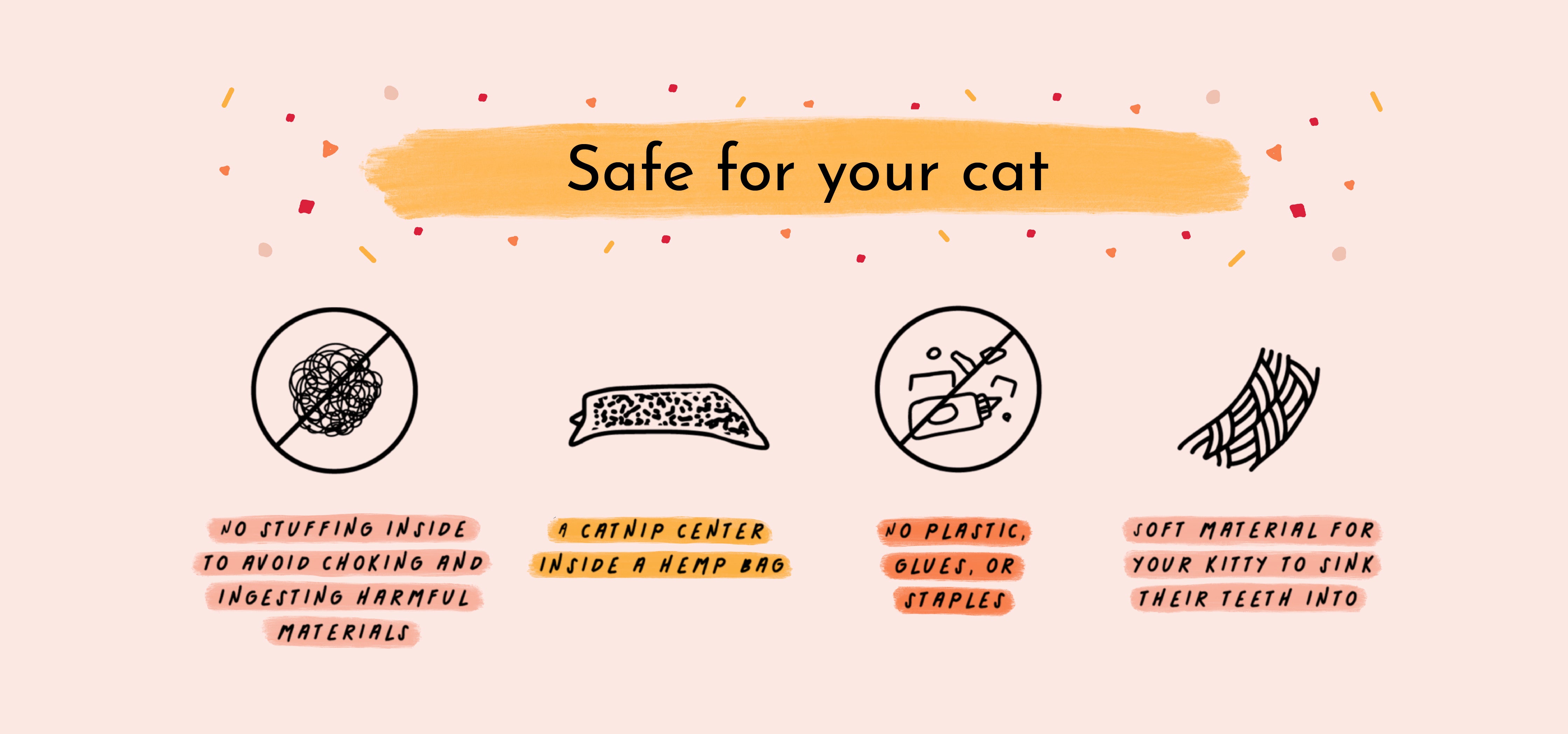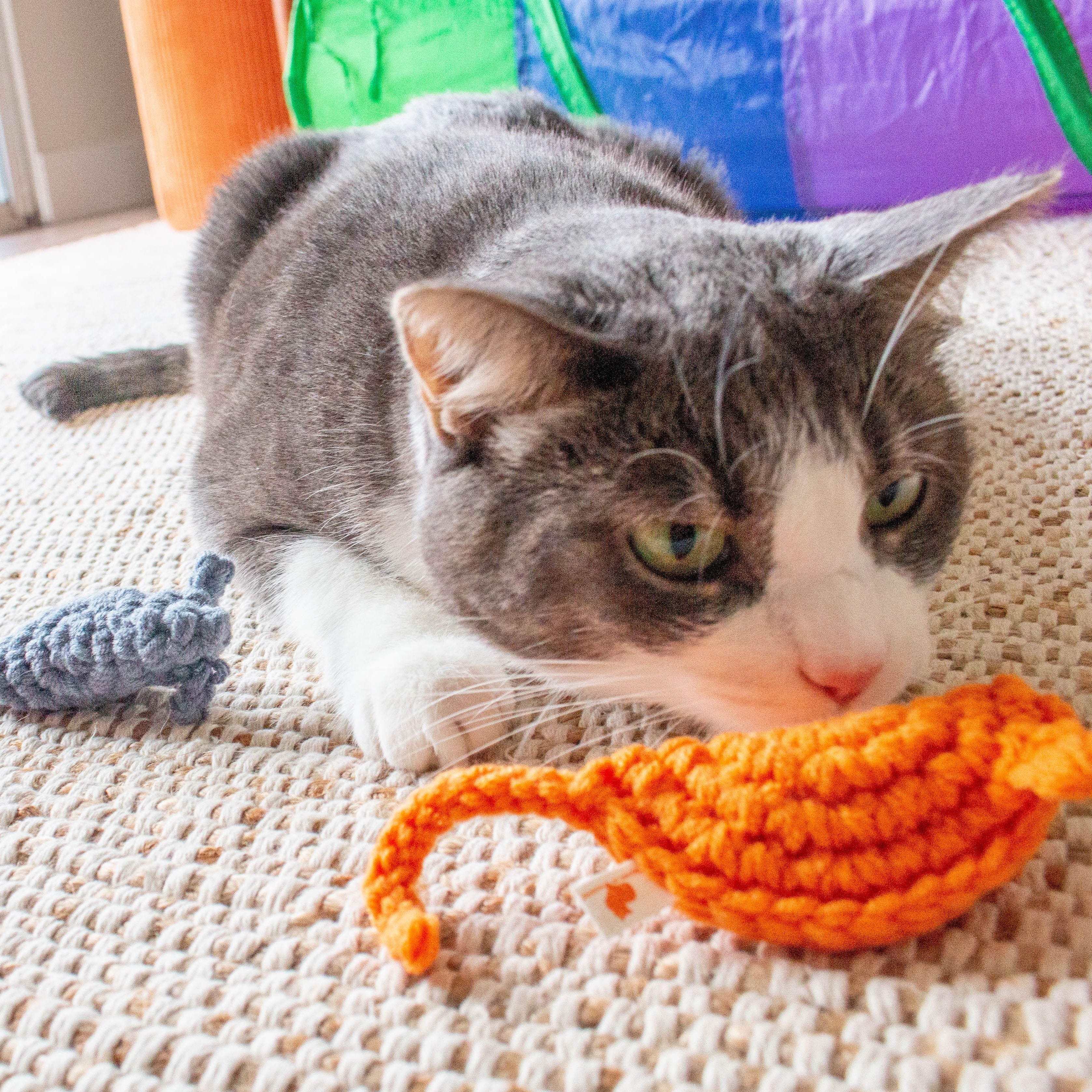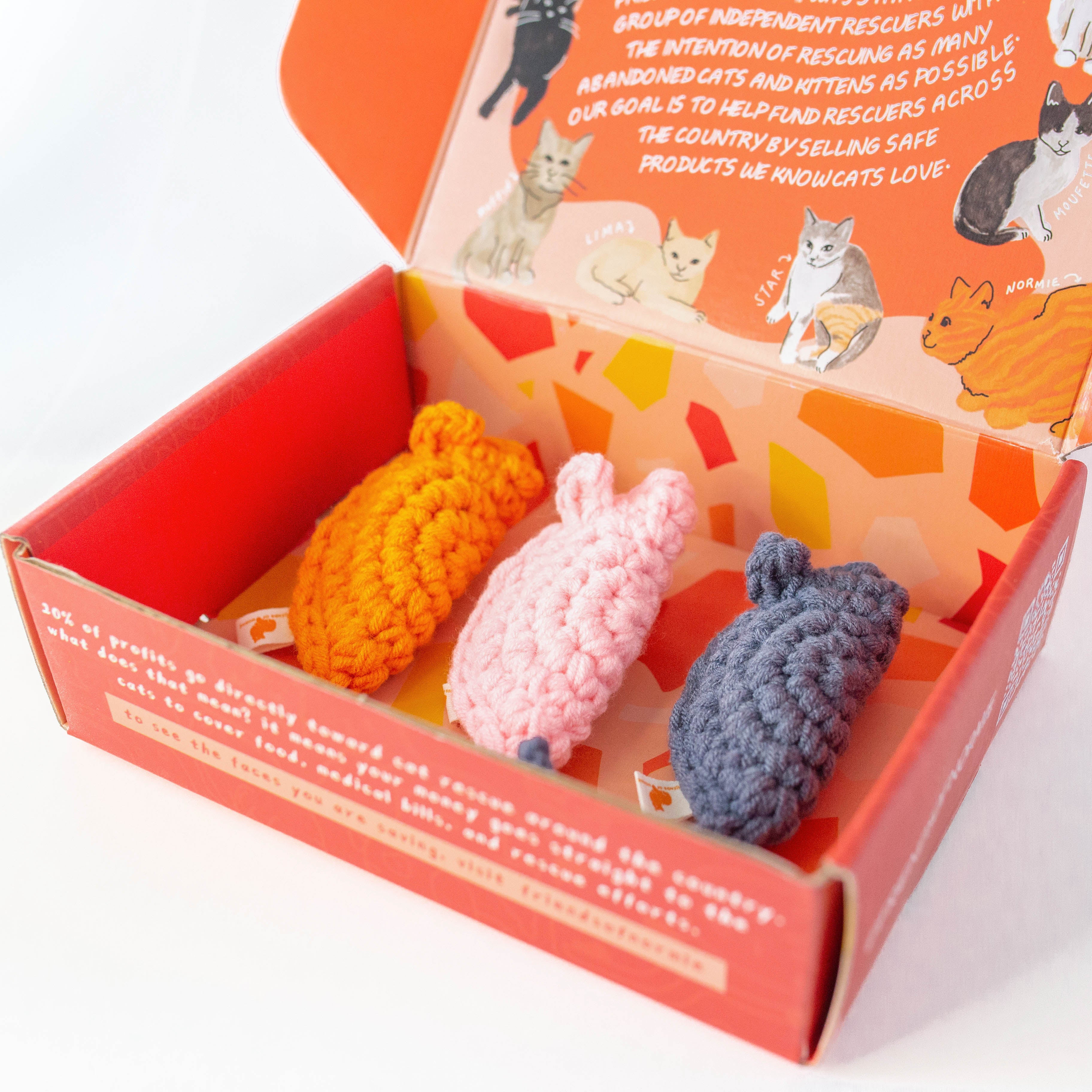 We designed and produced hand-crafted toy mice filled with organic catnip. These mice are made with organic yarn and are stuffing-free to prevent ingesting. The catnip inside each mouse is inside a hemp bag which will keep the catnip inside to avoid any mess. Our toy mice are free of any plastics, glues, staples or toxic materials. Essentially, these mice will allow your kitty to play as much as he or she wants to and will stay durable, and safe.